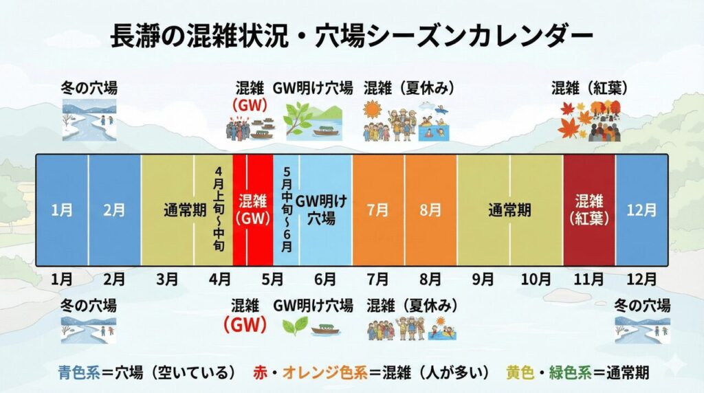 逆に混雑しがちなのがゴールデンウイークや7~8月、11月です。