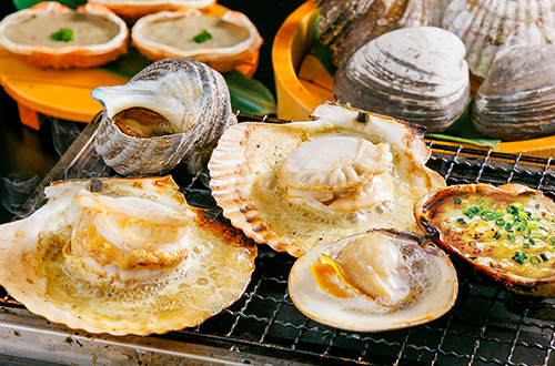 「海の家」をイメージした店内で、各テーブルに設置されたガスコンロで客自身がサザエやホタテ、蟹味噌の甲羅焼きなどを焼く、セルフ調理スタイルが最大の特徴です。