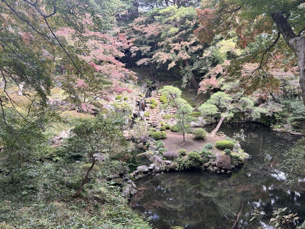 池を上から見るとこんな感じ。池を囲む赤く染まったモミジや、立派な松、苔むした岩などが一望できます。このときはちょっと曇ってしまっていましたが、快晴の日であれば池に反射するモミジも楽しめたかもしれません…!