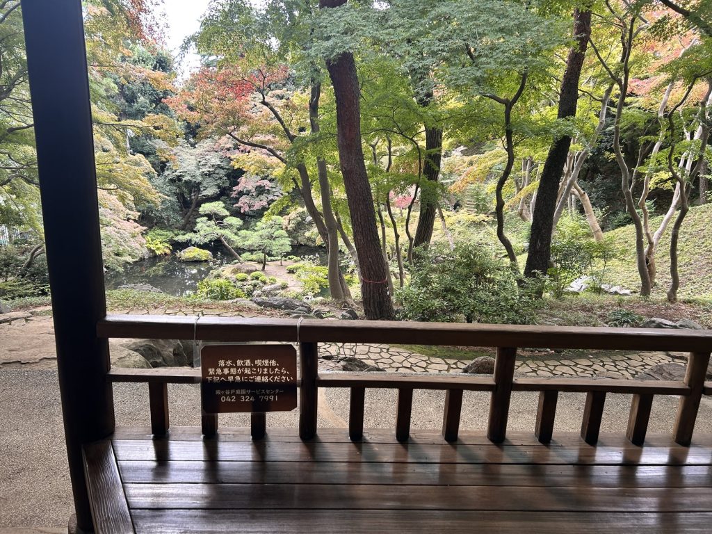 急な坂を登ると東屋(あずまや)のような和モダンな休憩場所が。庭園全体を見渡すことができ、モミジもしっかり見えました。